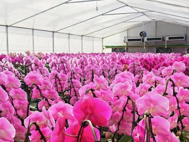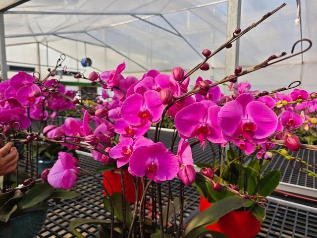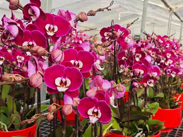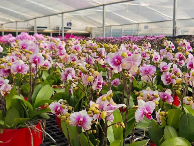 走进羊和村蝴蝶兰现代化智能温室花卉大棚,一股温暖而湿润的气息扑面而来,各色的蝴蝶兰争奇斗艳,有的热烈绽放,有的含苞待放,红的似火、粉的如霞,在翠绿叶片衬托下,洋溢着浓浓的节日气息。